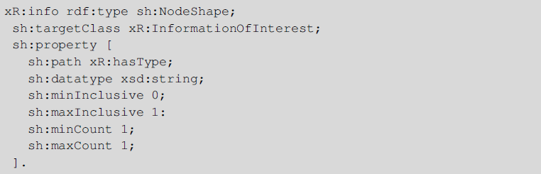 Additionally to the CQs, we performed a validation procedure in order to inspect the syntactic and structural quality of the metadata in the KG and to check the consistency of them. Abiding by the closed-world criteria, custom SHACL consistency checking rules and native ontology consistency checking, such as OWL 2 DL reasoning, were utilized. By using the first, one can discover constraint breaches such as cardinality contradictions or imperfect/missing information. By using the latter, the semantics at the terminological level, known as TBox, are taken into consideration as validation like in the occasion of class disjointness. An exemplary shapes constraint is shown below which unfolds a constraint which dictates that all targeted instances of the class ‘InformationOfInterest’ will always have exactly one string value in their datatype property ‘:hasType’.
