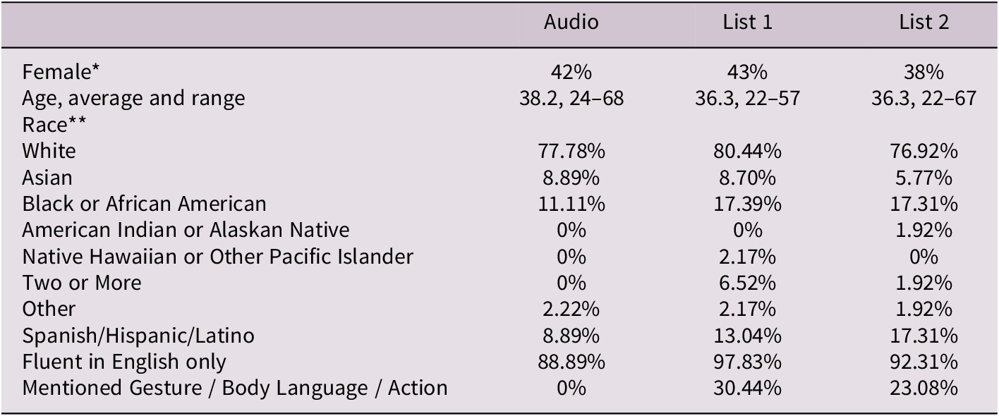 Notes: * Choices were Male/Female/Other, no participant identified as other; **Participants were asked “Do you identify as …?”.