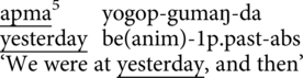 In contrast to sequence time, deictic time involves construing events relative to now, and thus separating out past, present, and future. Yupno words that are inherently deictic include apjok (‘today, now’), apma (‘yesterday’), usadon (‘tomorrow’, lit. ‘next dawn’), as well as less frequent terms for ‘day before yesterday’ (jagare) and ‘day after tomorrow’ (pɨdaŋ) (see Table 1). Apma and usadon can also be appended to other temporal units to indicate ‘last’ or ‘next’, as in apma sonda (‘last week’) or usadon krismas (‘next year’). A frequently used word is don (‘later, after’), often intensified as don-si. Overtly topographic words are somewhat rare in deictic time expressions, but they do occur. Particularly common is a pair of opposing deictic words: ɨsɨ-gap-mɨ (dem.up-side-poss) and ɨmɨ-gap-mɨ (dem.down-side-poss), which combine with time units like bulak to yield, for instance, ɨsɨ-gap-mɨ bulak (‘a few years from now’) and ɨmɨ-gap-mɨ bulak (‘a few years ago’). Also used are the demonstratives asudon (dem.up-loc) and amodon (dem.down-loc) to mean ‘at that time (in the future)’ and ‘at that time (in the past)’.