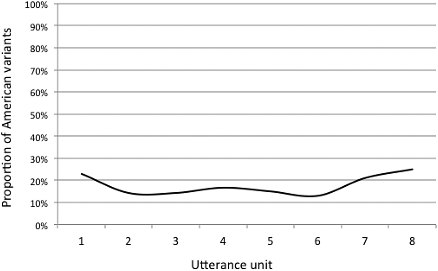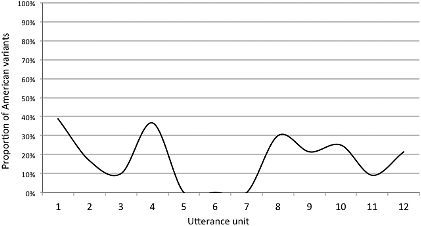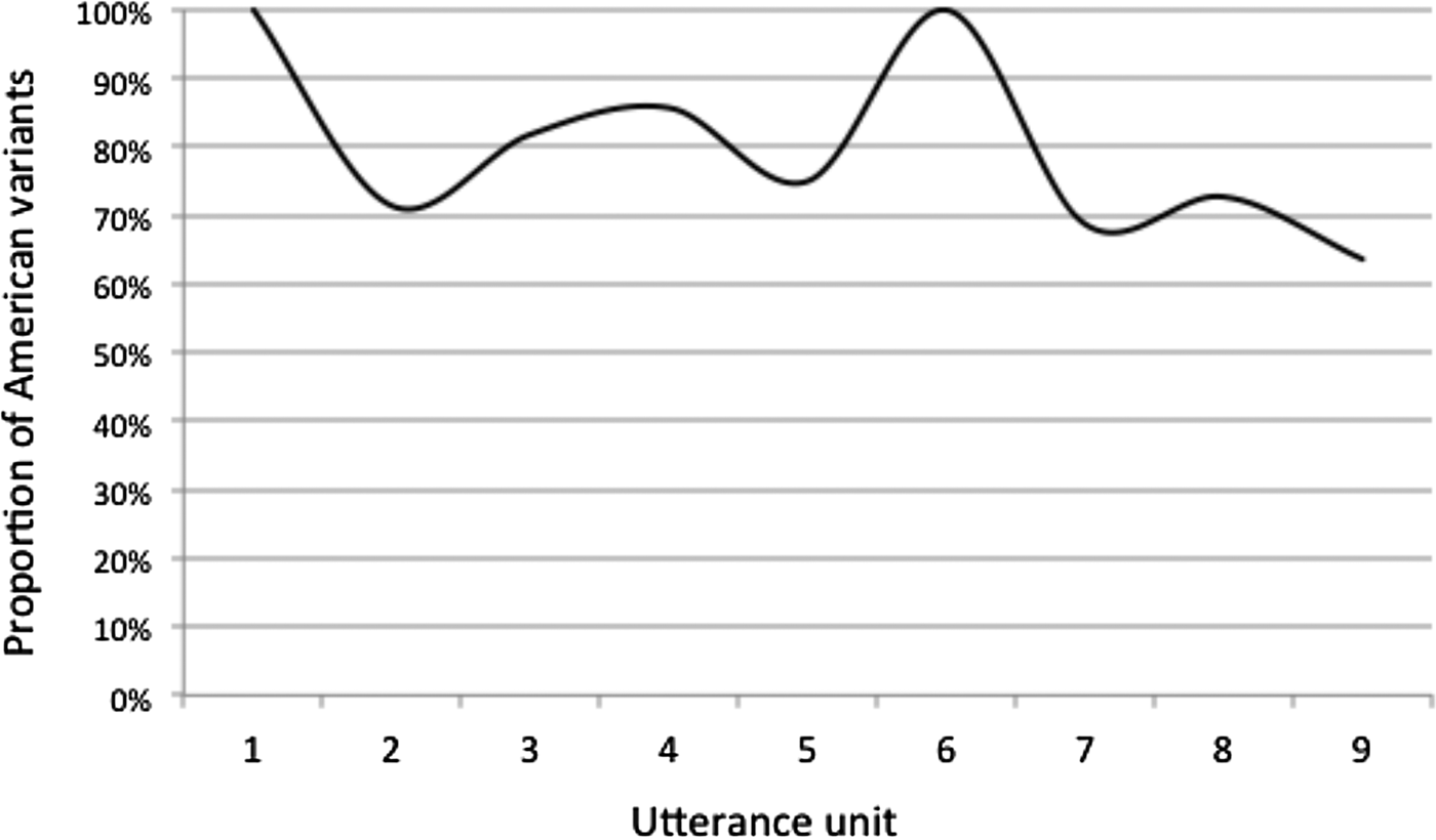 A sample analytic unit is shown in (1).Footnote 5 IPA is only used here to illustrate the coding; in all later transcripts, coded forms are simply underlined. Eighteen tokens of the twelve variables in Table 1 are instantiated in the unit. Of those, ten were uttered with AmE realizations and eight with IndE realizations. The overall proportion of AmE style is therefore .56 (56%).