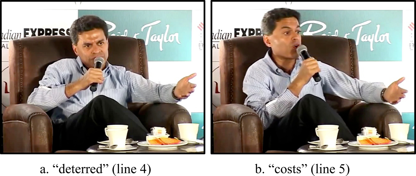 A number of embodied and prosodic changes accompany this tactical shift in lines 5–7, all pointing to an increase in attention to the new argument. The video stills in Figure 4 show changes in Zakaria's face and body as he introduces his new move. In the run-up to line 5, Zakaria's body has been positioned centrally, with a relaxed, thoughtful expression and unfocussed gaze (line 4 ‘deterred’). In the instant that he initiates the new persuasive move in line 5, Zakaria turns his body to more directly face an addressee, and changes his facial expression to wider eyes, raised eyebrows, direct eye contact, and a more confrontational expression (line 5 ‘costs’). Lines 5–7 are also accompanied by prosodic changes, including an increase in emphatic stress and a distinctive pitch contour, with the first emphatic word accompanied by a pitch rise and the second by a pitch fall, creating a striking melodic parallelism that sets the three lines apart from the surrounding utterances.
