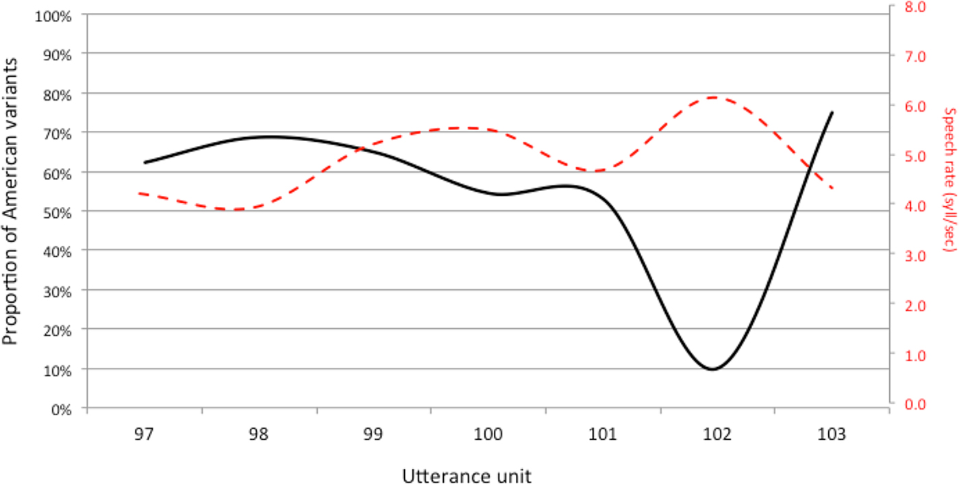 Figure 6 shows Zakaria's LFI profile for this segment. (The accompanying increase in speech rate is discussed later.) At the point of his persuasive shift in lines 24–26, Zakaria's use of IndE increases rather than decreases. He shifts in the same direction as he did with an Indian audience, as predicted by attention, not in the reverse direction, as predicted by audience design. The interpretation of this as an attentional effect is supported by a number of further details from the data, discussed next.