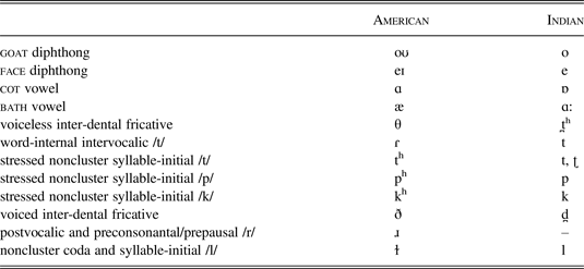Next, each unit is coded for a set of variables. For the present study, I classify variants according to two recognized lects: AmE and IndE. A similar metric could track individual variables; indeed, this would be a more data-driven approach, acknowledging that each variable may have a distinct indexical field (Eckert Reference Eckert2008). This might be preferable in situations where broad indexical values of variables are less clear. However, the particular interest here is a broad contrast between American and Indian style, relying on a conservative, indeed mostly enregistered, set of dialect contrasts.