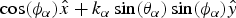 $\cos ({{\rm \phi} _{\rm \alpha}} )\hat x + {k_{\rm \alpha}} \sin ({{\rm \theta} _{\rm \alpha}} )\sin ({{\rm \phi} _{\rm \alpha}} )\hat y$, where