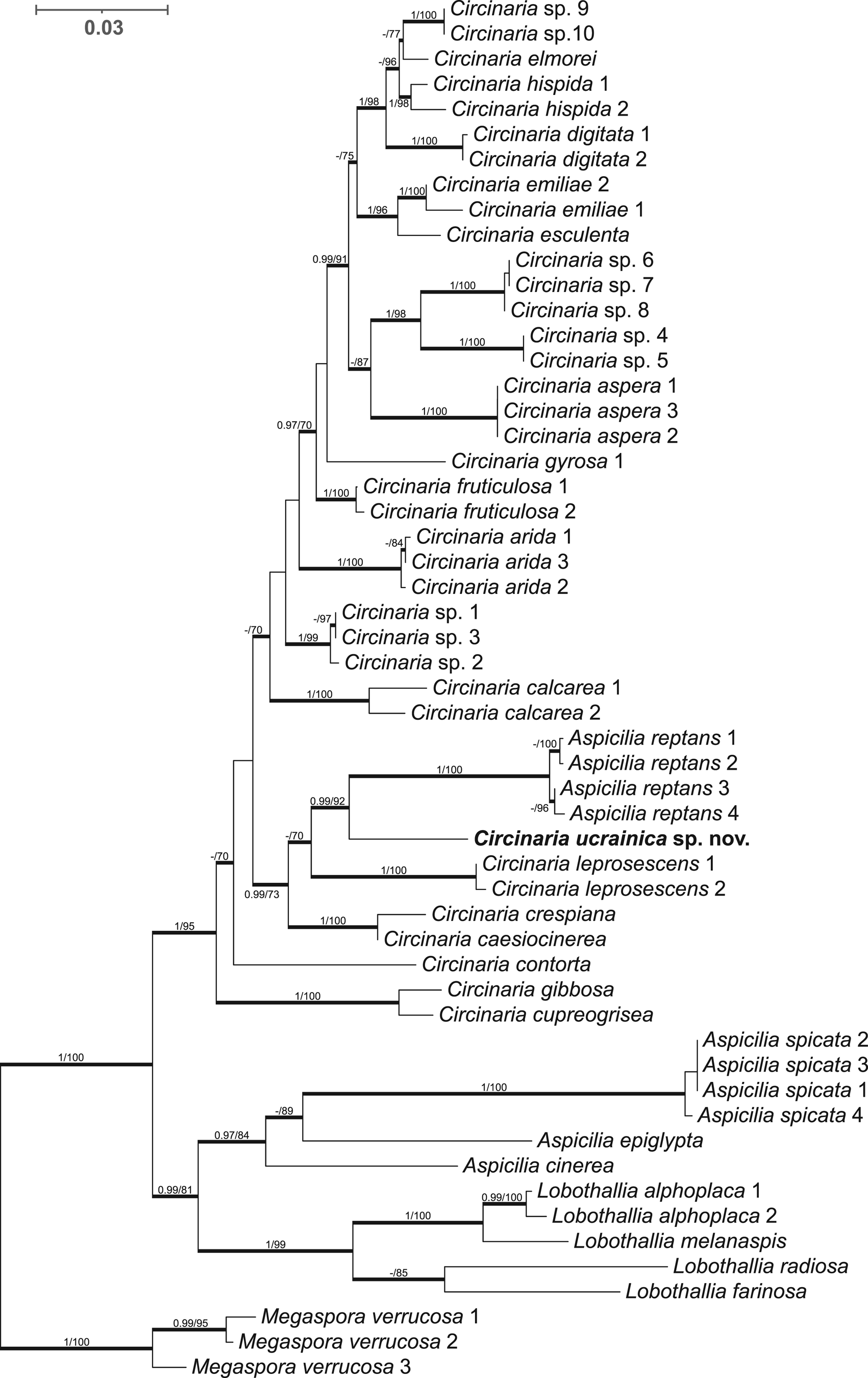 Figure 1. Phylogenetic placement of Circinaria ucrainica inferred from Bayesian inference (BI) analyses of the combined nrITS, nrLSU and mtSSU data set. Megaspora verrucosa was used as the outgroup. Bold branches represent either maximum likelihood (ML) bootstrap values ≥ 70 and/or Bayesian posterior probabilities ≥ 0.97. BI/ML values are indicated on branches. The new species is shown in bold.