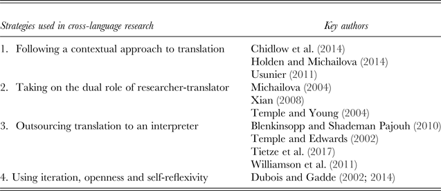 In our review, we focused on research based on primary data collection and identified four strategies that researchers have used to deal with language differences: i) following a contextual approach to translation, ii) taking on the dual role of researcher-translator, iii) outsourcing translation to an interpreter, and iv) using iteration, openness and self-reflexivity in the course of the research process. These are summarized in Table 1.