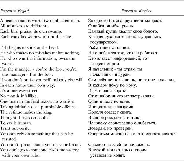 In our dataset, proverbs were used regardless of gender or age by approximately half of the research participants, who represented a variety of positions: top managers, middle managers and employees. This finding confirms the argument by Holden et al. (Reference Holden, Cooper and Carr1998: 186) that ‘it is not only less educated people who indulge in proverbs’ in Russia. It was noteworthy that talkative research participants often used proverbs during the interview, some of them even several. The theme of mistakes triggered the largest number of proverbs, such as ‘all mistakes are different’, which may indicate that mistakes play an important role in Russian society more generally. Otherwise there were no big differences in our data set in terms of how often each proverb was used by the research participants.
