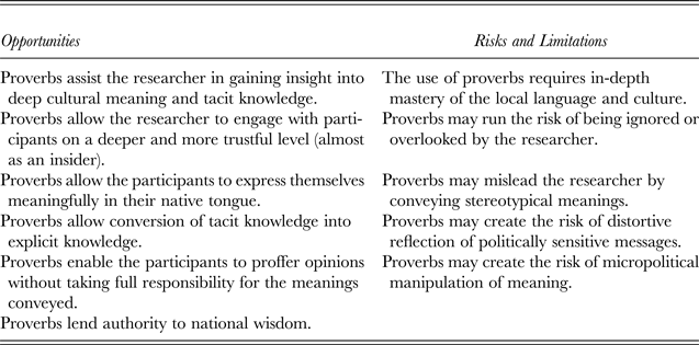 Despite the usefulness of proverbs in conveying contextual features, there are hardly any studies on the use of proverbs in organisational research. Even though some researchers mention proverbs as reflectors of cultural features (Holden, Reference Holden2008; Xian, Reference Xian2008), they rarely approach proverbs as methodological resources. One exception is Polsa (Reference Polsa2007), who recommends using proverbs in the same way as metaphors, antonyms, and synonyms to uncover cross-cultural differences. Considering the linguistic turn in international business research, (Marschan, Welch, & Welch, Reference Marschan, Welch and Welch1997; Piekkari, Welch, & Welch, Reference Piekkari, Welch and Welch2014) and in organisation studies more broadly (Alvesson & Kärreman, Reference Alvesson and Kärreman2000), further research on proverbs offers considerable potential. As our study has shown, although proverbs provide various opportunities for meaning making in cross-language research, their use may also involve risks and limitations as shown in Table 3.