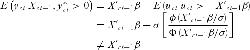 \begin{array}{rcl} E\left( {{y_{ct}}|{X_{ct - 1}},y_{ct}^* > 0} \right) &=& {{X'}_{ct - 1}}\beta + E\left( {{u_{ct}}|{u_{ct}} > - {{X'}_{ct - 1}}\beta } \right)\\ \quad \,\quad \,\quad \,\quad \,\quad \,\quad \,\;\; &=& {{X'}_{ct - 1}}\beta + \sigma \left[ {\displaystyle\frac{{\phi \left( {{{X'}_{ct - 1}}\beta /\sigma } \right)}}{{\Phi \left( {{{X'}_{ct - 1}}\beta /\sigma } \right)}}} \right]\\ \quad \,\quad \,\quad \,\quad \,\quad \,\quad \,\;\; &\ne& {{X'}_{ct - 1}}\beta \end{array}