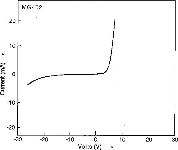 Under the same growth conditions we have grown p-n junction diodes on GaAs (1 1 1)B n+ substrates using Si doping for the approximately 1μm thick n-region followed by Mg doping for the p-region. The I-V spectrum for this sample is shown in see Figure 3 taken using a standard curve tracer at room temperature using contacts to the front surface and the substrate. The turn-on voltage is about 3 eV as would be expected. A reverse breakdown at −15 V is consistent with a doping level in the lightly p-doped region around 1017 cm−3. Mesa isolated and properly contacted samples are being prepared for studies of the light vs. current characteristics.