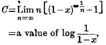 The above proof of the logarithmic series holds only when x is real. We see however that when x is positive the sum of the series A — C, which consists of positive terms, tends to the limit zero as η increases. This will therefore also hold when x is complex, and thus in any case when | x | < 1,  but which value is to be taken has to be decided by considerations of continuity.