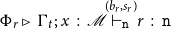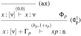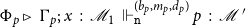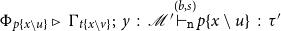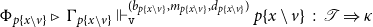 $\Phi _p \triangleright \, {\Gamma _p;\; x \;:\; \mathscr{M}} \Vdash ^{(b_p,m_p,d_p)}_{\tt v} {p}\;:\;{\mathscr{T\;} \Rightarrow \kappa }$
