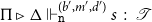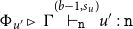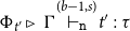 $\Phi ' \triangleright \,{\Gamma } \Vdash ^{(b',m',|{(u,q)}|_{\texttt {v}})}_{\tt v} {(t',s')}\;:\;{\kappa }$