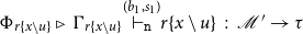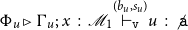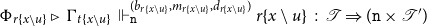 $\Phi _u \triangleright \, {\Gamma _{p \{x \setminus v\}}} \Vdash ^{(b_{p \{x \setminus v\}},m_{p \{x \setminus v\}},d_{p \{x \setminus v\}})}_{\tt v} {p \{x \setminus v\}}\;:\;{\{l \;:\; \mathscr{M}_2\};\; \mathscr{T\;} \Rightarrow \kappa }$