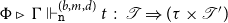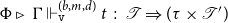 $\Phi '_p \triangleright \, {\Gamma _p} \Vdash ^{(b_p,m_p,d_p)}_{\tt v} {p}\;:\;{\mathscr{T\;}''' \Rightarrow (\mathscr{M} \rightarrow (\mathscr{T\;}'' \Rightarrow \kappa )) \times \mathscr{T\;}'''}$