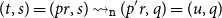$(t,s) = (pr,s) \rightsquigarrow _{{\tt v}} (p'r,q) = (u,q)$