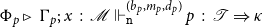 $\Phi _p \triangleright \, {\Gamma _p} \Vdash ^{(b_p,m_p,d_p)}_{\tt v} {p}\;:\;{\{l \;:\; {\mathscr{M} \cdot \mathscr{L\;}}\};\; \mathscr{T\;} \Rightarrow \kappa }$