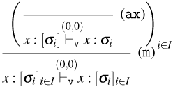 \begin{equation*} \frac {(\Phi ^i_t)_{i \in I}}{+_{i \in I} \Gamma ^i_t;\; x \;:\; \mathscr{M} \Vdash ^{(+_{i \in I} b^i_t, +_{i \in I} m^i_t, +_{i \in I} d^i_t)} t\;:\; [ \sigma _i ]}({\tt m})\end{equation*}