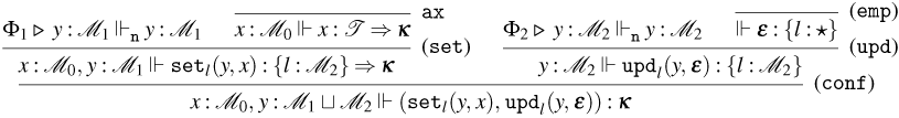 \begin{equation*} \frac {\Phi _{v} \triangleright \, {\Gamma _v} \Vdash ^{(b_v,m_v,d_v)}_{\tt v} {v}\;:\;{\mathscr{M}}\qquad \Pi _{s} \triangleright \, {\Delta _s} \Vdash ^{(b_s,m_s,d_s)}_{\tt v} {s}\;:\;{{\{l\;:\;\mathscr{L\;}\};\;}\mathscr{T\;}}}{\Gamma _v + \Delta _s \Vdash ^{(b_v+b_s,m_v+m_s,d_v+d_s)} {\tt upd}_{l}(v,s): \{l \;:\; {\mathscr{M} \cdot \mathscr{L\;}}\};\; \mathscr{T\;}}({\tt upd}) \end{equation*}