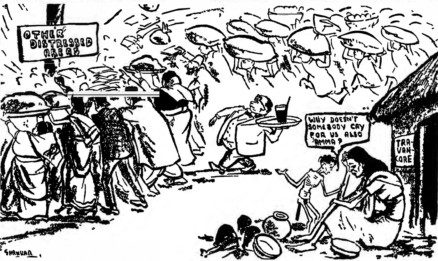 Covering the food shortage across the country for the Hindustan Times in late 1943, journalist and nationalist politician K. Santhanam (1895–1980) lamented that, despite India’s considerable natural resource endowments and successful avoidance of enemy invasion, ‘the cry of hunger and distress is heard from Trivandrum to Chittagong, One feels angry and bitter at this inexplicable tragedy.’Footnote 1 Santhanam’s booklet of collected articles from that year, Cry of Distress, captured the experience of hunger across India. Accompanying an article on the princely state of Travancore—the capital of which was Trivandrum—was an image by the country’s most famous cartoonist and Travancore native, Shankar (Figure 1).Footnote 2 Whereas ‘other distressed areas’, as Shankar dubbed them, were being practically inundated with stocks of food from people of different communities (delineated by dress), Travancore was receiving nothing. At the centre of the image, a corpulent waiter dressed in the Western style brings a drink on a platter towards these areas. Outside the hut, an undernourished mother sits with her hand on her head alongside scattered and empty pots and pans. An emaciated child, grabbing her by the arm, asks ‘Why doesn’t somebody cry for us also, Amma [Mother]?’
