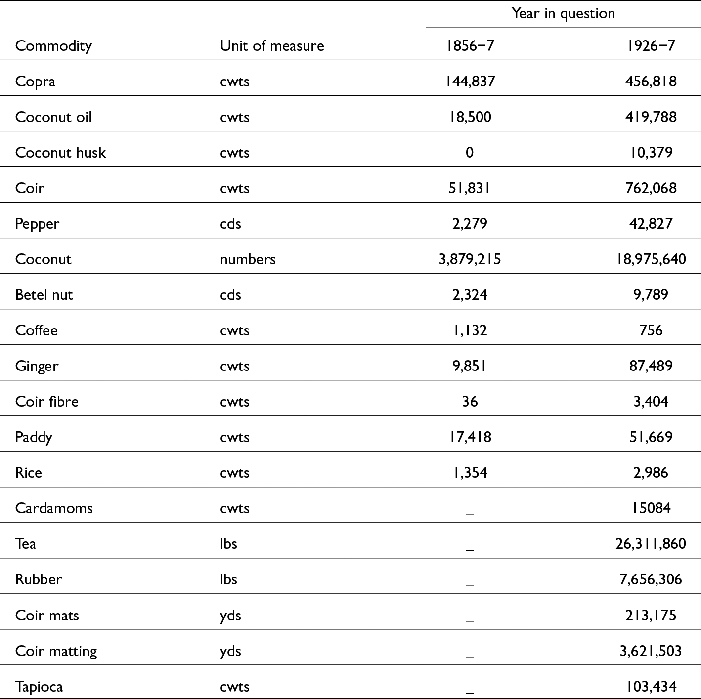 Table 1: Exports from Travancore (quantities).