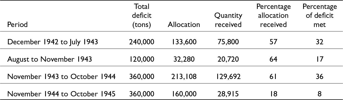 One source of rice for Travancore became the British Government of India’s newly created apparatus to move rice from surplus to deficit regions under a Basic Plan. This new Food Department, fashioned haphazardly, kicked into action as conditions in Bengal deteriorated.Footnote 113 Its priorities did not lie in South India.Footnote 114 Rice travelled by great distances on the already overburdened railways to get to Travancore, creating opportunities for pilferage along the way.Footnote 115 Deliveries of food to Travancore, calculated on the basis of absolute shortages rather than supplies available, fell far short of the pledged amounts (see Table 4).