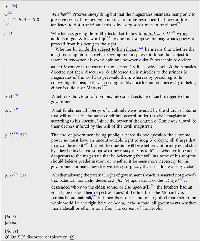 • O2  “Qs On S.Ps discourse of toleration” (MS Locke c. 39, fos. 7–8).