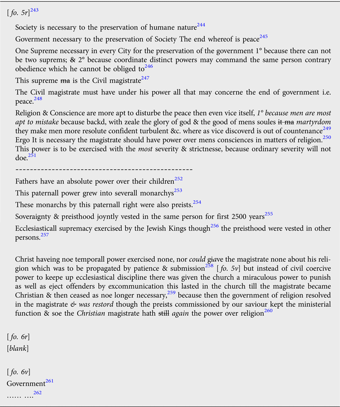 The Bodleian manuscripts of Locke's commentary on Parker do not refer to this position. They echo many portions of the Chapel Hill manuscript. “What fundamentall libertys of mankinde were invaded by the church of Rome,” Locke asks again, in one of the Bodleian manuscripts.Footnote 118 They also elaborate on queries that the Chapel Hill manuscript presents only elliptically. In the latter, Locke notes that Parker supposes Nonconformists to be “always in mistakes.” As Locke adds, however, the knowledge of whether their practices or beliefs are erroneous is indeterminable in “indifferent” matters, which is precisely why they are “indifferent.” The Bodleian manuscripts expand on this point by asking whether Parker supposes “the magistrates power to proceed from his being in the right.”Footnote 119 This would postulate a basis for the magistrate's authority—rectitude in theology—that is separable from merely “preserving peace.” But how, Locke asks, can one resolve a contradiction between the imperatives of rectitude in theology and the imperatives of civil peace? The power to preserve the latter, the Bodleian manuscripts continue, “is by every sober man to be allowd.”Footnote 120 But either it can extend to any religious belief that the magistrate considers dangerous to civil peace, a point that is not short of “Mr Hobbs's doctrine,” or it cannot, in which case Parker concedes that there must be limits to the magistrate's authority. If those limits are determined by theology, the debate will return to the same impasse that characterizes the question of “indifferency.” In place of arguing over what is or is not indifferent, Locke implies in the Chapel Hill manuscript, it is easier merely to stipulate a subject's “beleife of god in general.”