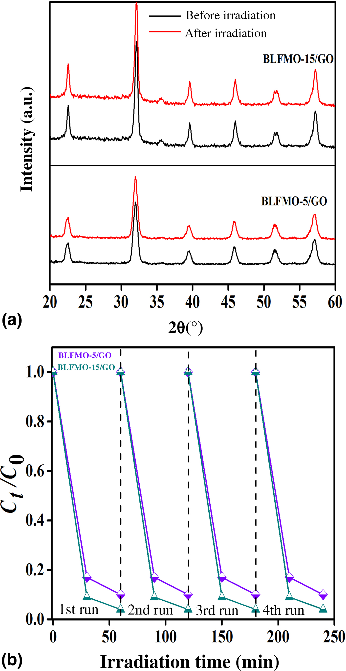 Figure 10. (a) XRD curves of BLFMO/GO nanohybrids in the beginning and at the end of photocatalytic reaction. (b) Stable photocatalytic curves for the BLFMO-5/GO and BLFMO-15/GO nanohybrids up to four cycles.