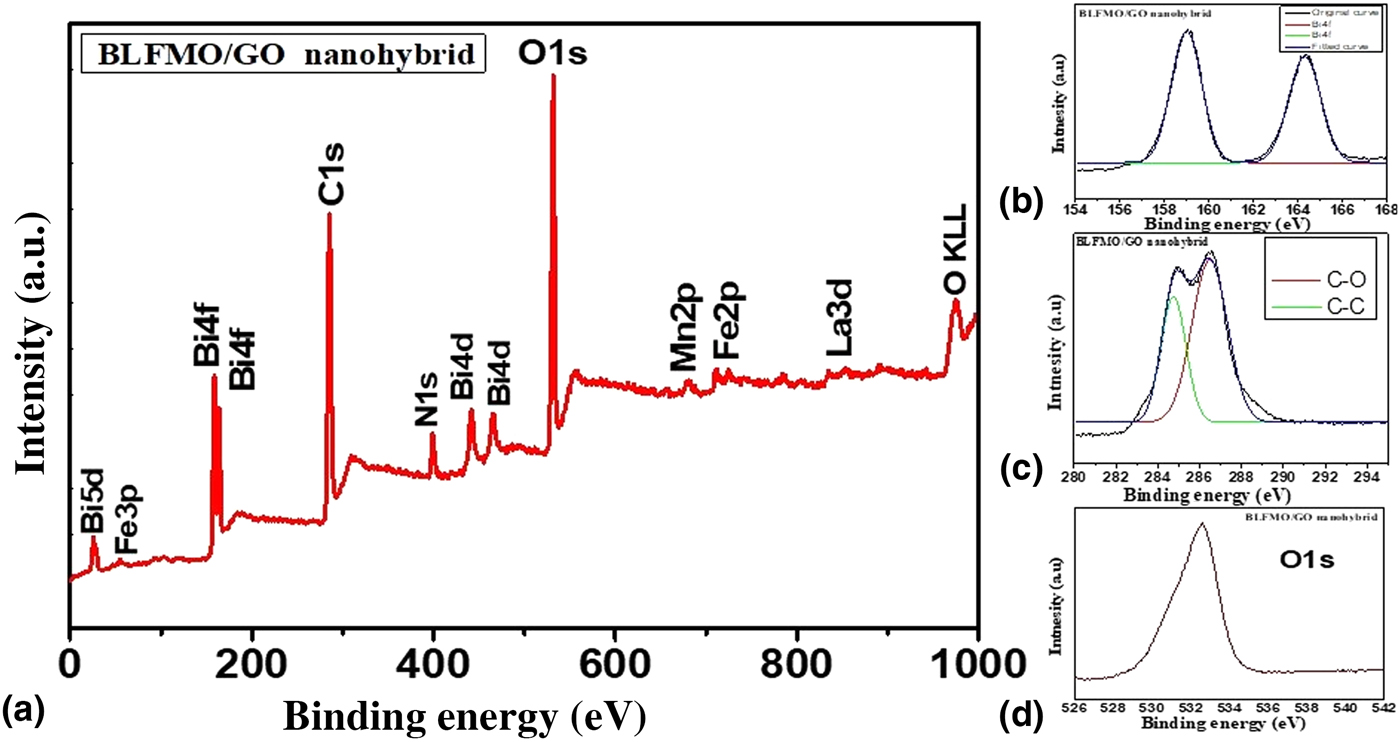 XPS investigation was done in order to probe the chemical composition of BLFMO/GO nanohybrids. The XPS spectra are shown in Fig. 4. The XPS spectra give us the detailed information related to the chemical bonding present inside the BLFMO and GO. Figure 4(a) shows all chemical bonds of Bi, La, Fe, Mn, O, and C present inside the BLFMO/GO nanohybrid with respect to their binding energies.[Reference Li, Shen, Yang, Lei, Guan, Lin, Liu and Nan30, Reference Li, Cao, Wang and Yuan50, Reference Xu, Sheng, Khalid, Cao, Wang, Qiu, Zhang, He, Wang, Zhou, Li, Wu, Zhai, Liu, Wang, Xu and Du51] The major components (Bi, C, and O) of the nanohybrid structures are also shown in Figs. 4(b)–4(d). Two main peaks of Bi4f are obtained in the range of 156–166 eV [Fig. 4(b)]. Similarly, two species are present inside C1s [Fig. 4(c)] corresponding to C