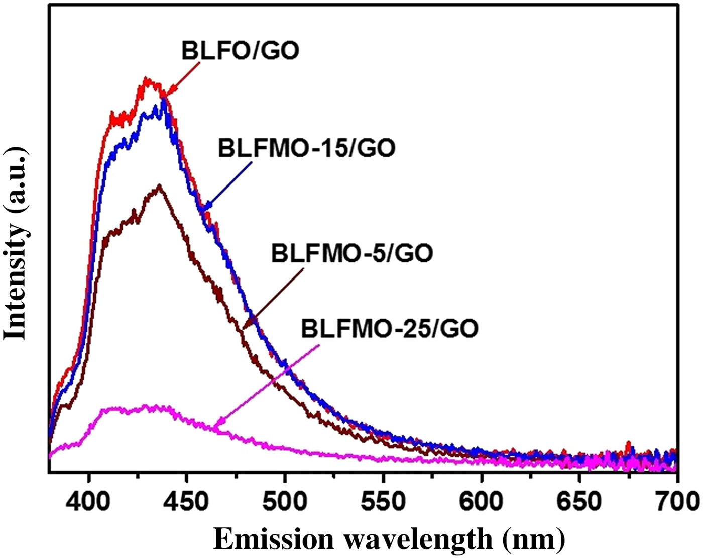 Figure 6. PL spectra of BLFMO-5/GO and BLFMO-15/GO nanohybrids.