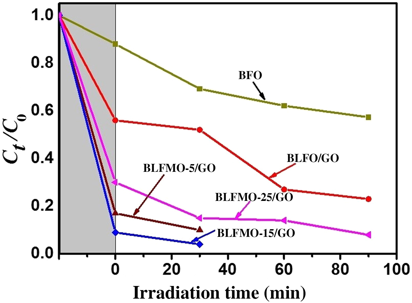 Figure 9. The photocatalytic activities of BLFMO/GO nanohybrids in comparison with pure BiFeO3.