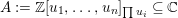 $A:=\mathbb{Z}[u_{1},\ldots ,u_{n}]_{\prod u_{i}}\subseteq \mathbb{C}$