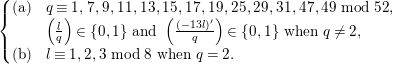 $\left\{\begin{array}{@{}ll@{}}(\text{a}) & q\equiv 1,7,9,11,13,15,17,19,25,29,31,47,49\hspace{0.2em}{\rm mod}\hspace{0.2em}52,\\ & \left(\frac{l}{q}\right)\in \{0,1\}\text{and }\left(\frac{(-13l)^{\prime }}{q}\right)\in \{0,1\}\text{when }q\neq 2,\\ (\text{b}) & l\equiv 1,2,3\hspace{0.2em}{\rm mod}\hspace{0.2em}8\text{ when }q=2.\end{array}\right.$