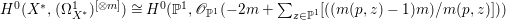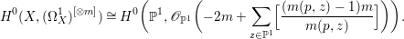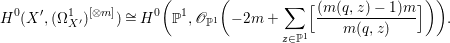 $$\begin{eqnarray}H^{0}(X,({\rm\Omega}_{X}^{1})^{[\otimes m]})\cong H^{0}\biggl(\mathbb{P}^{1},\mathscr{O}_{\mathbb{ P}^{1}}\biggl(-2m+\mathop{\sum }_{z\in \mathbb{P}^{1}}[\frac{(m(p,z)-1)m}{m(p,z)}]\biggr)\biggr).\end{eqnarray}$$ In particular, the number of