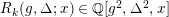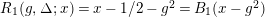 $$\begin{eqnarray}\displaystyle R_{3}(g,\unicode[STIX]{x1D6E5};x) & = & \displaystyle x^{3}-\left(3g^{2}+\frac{3}{2}\right)x^{2}+\left(3g^{4}+3g^{2}+3\unicode[STIX]{x1D6E5}^{2}+\frac{1}{2}\right)x-g^{6}\nonumber\\ \displaystyle & & \displaystyle -\,\frac{3}{2}g^{4}-\frac{1}{2}g^{2}-\frac{3}{2}\unicode[STIX]{x1D6E5}^{2}-g^{2}\unicode[STIX]{x1D6E5}^{2}\nonumber\\ \displaystyle & = & \displaystyle B_{3}(x-g^{2})+3\unicode[STIX]{x1D6E5}^{2}B_{1}(x-g^{2})+2g^{2}\unicode[STIX]{x1D6E5}^{2}.\nonumber\end{eqnarray}$$