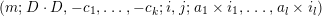 $(m;D\cdot D,-c_{1},\ldots ,-c_{k};i,j;a_{1}\times i_{1},\ldots ,a_{l}\times i_{l})$