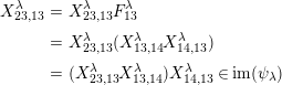 $$\begin{eqnarray}\displaystyle X_{23,13}^{\unicode[STIX]{x1D706}} & = & \displaystyle X_{23,13}^{\unicode[STIX]{x1D706}}F_{13}^{\unicode[STIX]{x1D706}}\nonumber\\ \displaystyle & = & \displaystyle X_{23,13}^{\unicode[STIX]{x1D706}}(X_{13,14}^{\unicode[STIX]{x1D706}}X_{14,13}^{\unicode[STIX]{x1D706}})\nonumber\\ \displaystyle & = & \displaystyle (X_{23,13}^{\unicode[STIX]{x1D706}}X_{13,14}^{\unicode[STIX]{x1D706}})X_{14,13}^{\unicode[STIX]{x1D706}}\in \text{im}(\unicode[STIX]{x1D713}_{\unicode[STIX]{x1D706}})\nonumber\end{eqnarray}$$