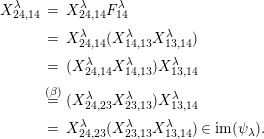 $$\begin{eqnarray}\displaystyle X_{24,14}^{\unicode[STIX]{x1D706}} & = & \displaystyle X_{24,14}^{\unicode[STIX]{x1D706}}F_{14}^{\unicode[STIX]{x1D706}}\nonumber\\ \displaystyle & = & \displaystyle X_{24,14}^{\unicode[STIX]{x1D706}}(X_{14,13}^{\unicode[STIX]{x1D706}}X_{13,14}^{\unicode[STIX]{x1D706}})\nonumber\\ \displaystyle & = & \displaystyle (X_{24,14}^{\unicode[STIX]{x1D706}}X_{14,13}^{\unicode[STIX]{x1D706}})X_{13,14}^{\unicode[STIX]{x1D706}}\nonumber\\ \displaystyle & \overset{(\unicode[STIX]{x1D6FD})}{=} & \displaystyle (X_{24,23}^{\unicode[STIX]{x1D706}}X_{23,13}^{\unicode[STIX]{x1D706}})X_{13,14}^{\unicode[STIX]{x1D706}}\nonumber\\ \displaystyle & = & \displaystyle X_{24,23}^{\unicode[STIX]{x1D706}}(X_{23,13}^{\unicode[STIX]{x1D706}}X_{13,14}^{\unicode[STIX]{x1D706}})\in \text{im}(\unicode[STIX]{x1D713}_{\unicode[STIX]{x1D706}}).\nonumber\end{eqnarray}$$