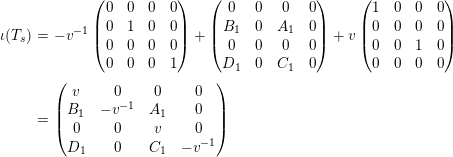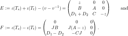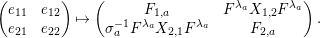 $$\begin{eqnarray}\displaystyle & & \displaystyle \left(\begin{array}{@{}cccccc@{}}e_{11} & e_{12} & & & & \\ e_{21} & e_{22} & e_{23} & & & \\ & e_{32} & e_{33} & e_{34} & & \\ & & e_{43} & e_{44} & e_{45} & \\ & & & e_{54} & e_{55} & e_{56}\\ & & & & e_{65} & e_{66}\end{array}\right)\nonumber\\ \displaystyle & & \displaystyle \quad \mapsto \left(\begin{array}{@{}cccccc@{}}F_{12}^{\unicode[STIX]{x1D706}} & X_{12,13}^{\unicode[STIX]{x1D706}} & & & & \\ X_{13,12}^{\unicode[STIX]{x1D706}} & F_{13}^{\unicode[STIX]{x1D706}} & X_{13,14}^{\unicode[STIX]{x1D706}} & & & \\ & X_{14,13}^{\unicode[STIX]{x1D706}} & F_{14}^{\unicode[STIX]{x1D706}} & X_{14,13}^{\unicode[STIX]{x1D706}}X_{13,23}^{\unicode[STIX]{x1D706}} & & \\ & & X_{23,13}^{\unicode[STIX]{x1D706}}X_{13,14}^{\unicode[STIX]{x1D706}} & F_{23}^{\unicode[STIX]{x1D706}} & X_{23,24}^{\unicode[STIX]{x1D706}} & \\ & & & X_{24,23}^{\unicode[STIX]{x1D706}} & F_{24}^{\unicode[STIX]{x1D706}} & X_{24,34}^{\unicode[STIX]{x1D706}}\\ & & & & X_{34,24}^{\unicode[STIX]{x1D706}} & F_{34}^{\unicode[STIX]{x1D706}}\end{array}\right).\nonumber\end{eqnarray}$$