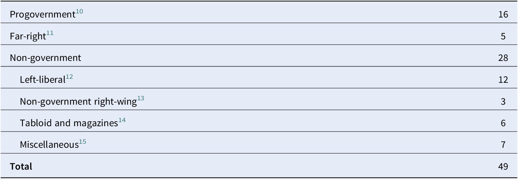 The progovernment category contains outlets from CEMPF and public service media, while the far-right group contains those connected to the far-right party, Mi Hazánk Mozgalom (Our Homeland Movement) and the far-right movement in Hungary.Footnote 8 Our research also included six tabloid newspapers and magazines that do not belong to the progovernment media conglomerate. The tabloid media are represented by one site, which was the sixth most-read website in 2020. The magazines included in our research are women’s magazines, among which we find very and less popular ones. There is one remaining group that needs to be explained. The nongovernment, right-wing group contains outlets linked to Jobbik and others that were created by right-wing journalists whose media outlets fell victim to Fidesz’s ideologically and organizationally centralizing media policy.