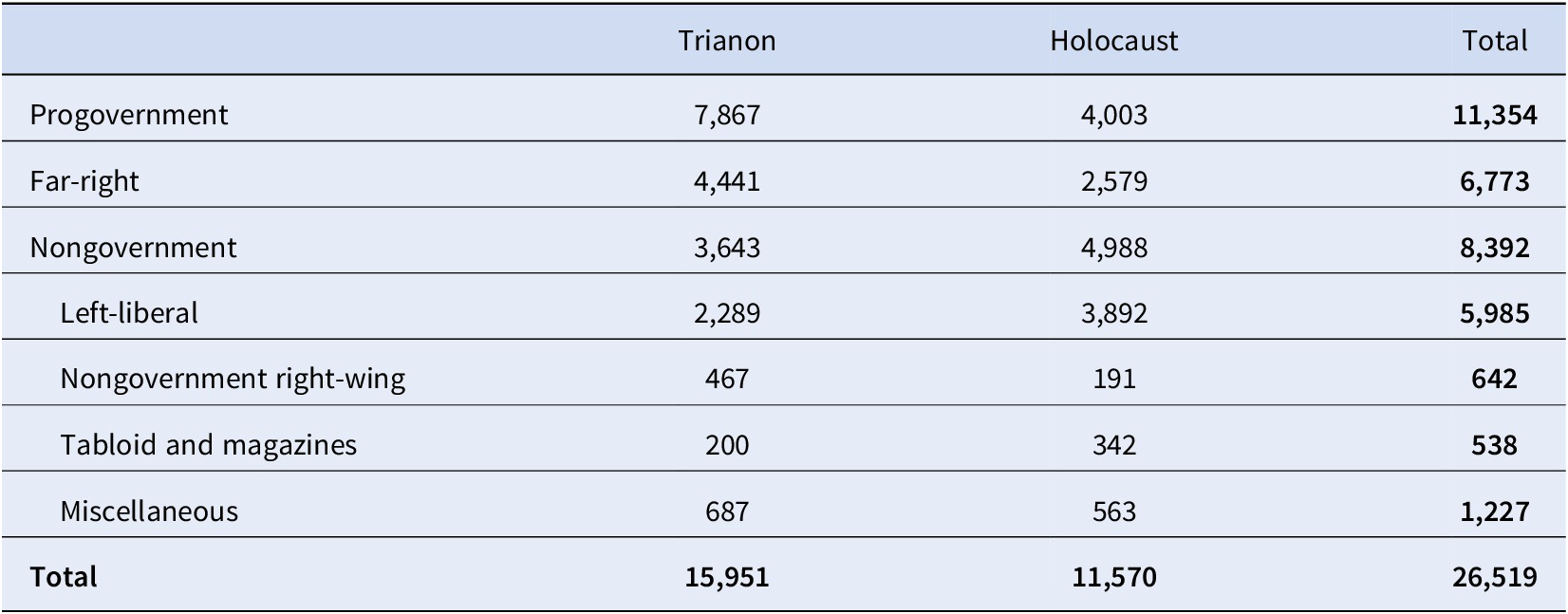 As we wanted to analyze whether the latent topics and the discursive framing of Trianon and the Holocaust differed in articles from sites with different political leanings, we formed three main groups: progovernment, far right, and nongovernment. While the first two groups were politically homogeneous, the latter was not. It consisted of news sites ranging from the Jobbik-related, right-wing Alfahír to the left-liberal Magyar Narancs, as well as tabloid media sites and online magazines. Therefore, we broke down this category into four groups: left-liberalFootnote 7 , nongovernment right-wing, tabloid and magazines, and miscellaneous.