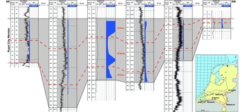 During the Savian tectonic phase which started around late Rupelian – early Chattian tomes (Fig. 15), the northern part of the West Netherlands Basin was uplifted (inversion). This caused partial or complete erosion of the RCM, as indicated by the uncertain thickness in the area (Fig. 9). The effect of the inversion and erosion is clearly visible in an offshore seismic section (Fig. 16). Important unconformities are not identified in the Roer Valley Graben, while they are seen in Belgium, so they only seem to occur in proximal regions.