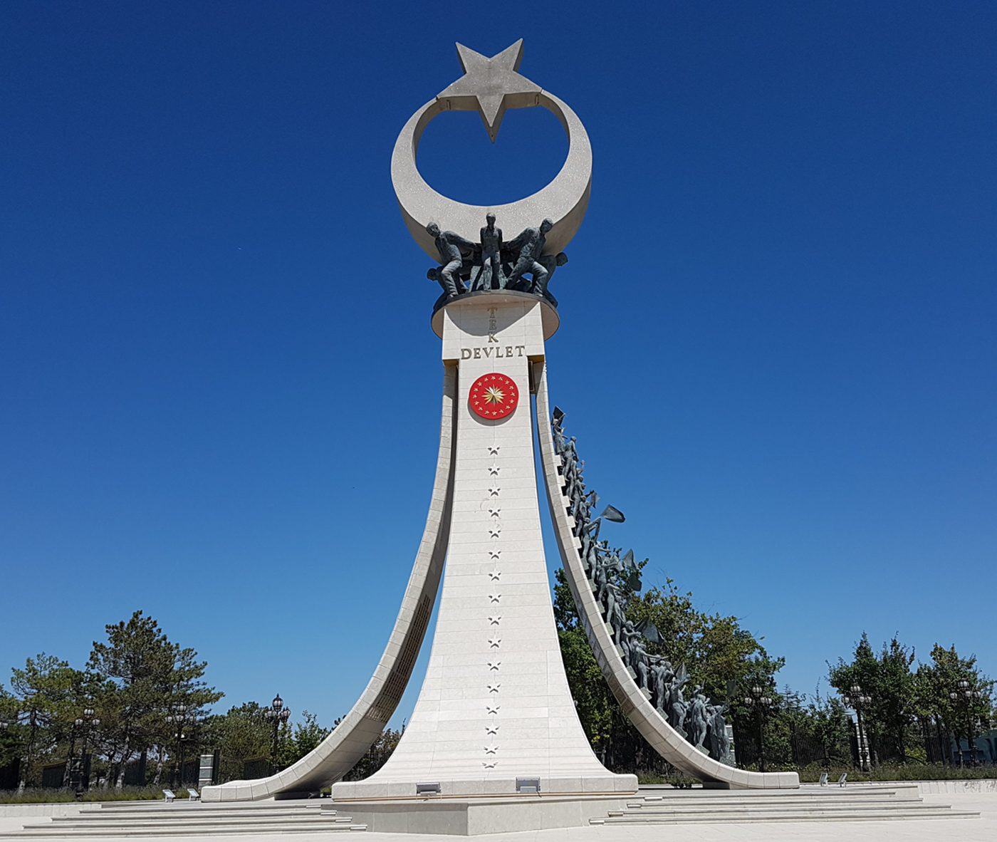 The other facets are somewhat less interesting and include more generic national symbols such as a carving of the Turkish flag (“one flag”) and a map of Turkey and the names of its provinces (“one homeland”), while “one country” includes the symbol of the presidency of Turkey and the sixteen stars representing past Turkish states. On top of the four facets there are seven figures, representing the seven regions of Turkey, bearing the Star and Crescent, the symbols of the Turkish flag. Beneath the monument a black marble slab was placed with the names of the martyrs, and the facets’ inner sides are covered with small memorial plaques with the martyrs’ names and pictures.