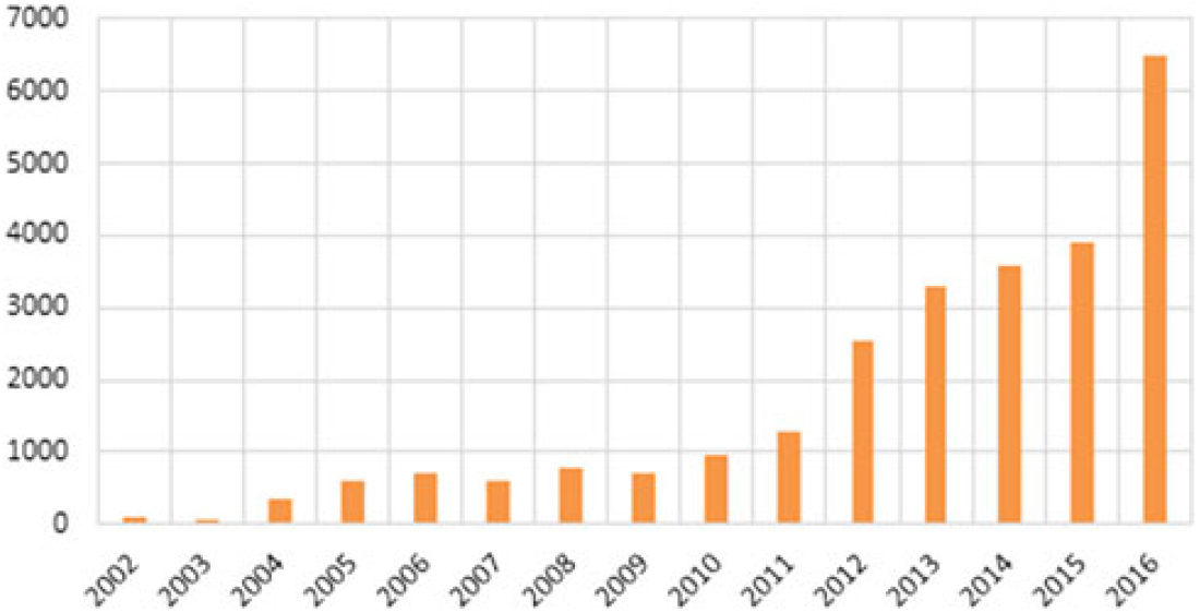While the first instances of Turkish foreign aid date back to 1992, this aid was provided in only a very limited amount and across a relatively narrow geographic scope for over a decade, until Turkey gradually started adopting an internationalist foreign policy beginning in 2005.Footnote 1 The recovery of Turkey’s economy after the 2001 crisis and the subsequent positive boom in the markets, alongside constructive relations with the European Union (EU), helped the AKP to increase its aid budget, which in turn resulted in the adoption of foreign assistance as one of the state’s key foreign policy tools, or as a niche diplomacy. Figure 1 illustrates the exponential increase in the amount of money that Turkey has allocated to aid over the last decade.