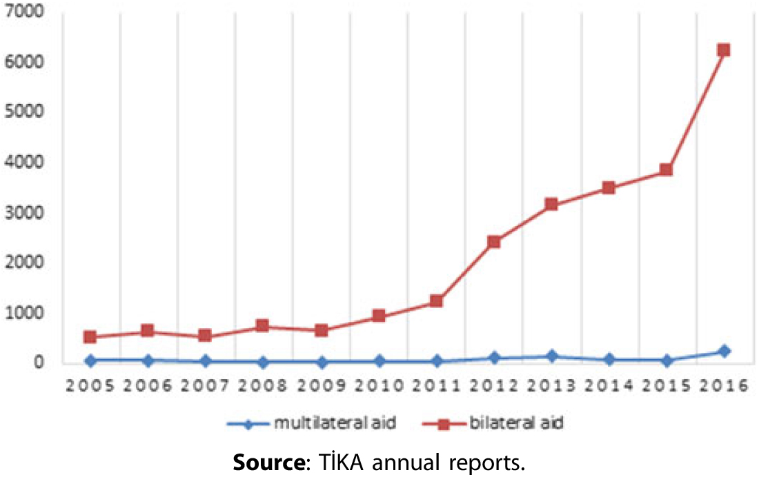 As seen in Figure 1, after 2005 the general tendency to increase the amount of aid continued without falling under the 500-million US dollar threshold. Turkey is a prominent rising donor whose aid disbursement in 2016, according to the Organisation for Economic Co-operation and Development’s (OECD) ODA statistics, surpassed that of other non-member donors of the OECD’s Development Assistance Committee (DAC), with the sole exception of Saudi Arabia. The difference between the amounts of bilateral and multilateral aid disbursed by Turkey is quite large in favor of bilateral aid, as seen in Figure 2. The ratio of multilateral aid in total flows was 11 percent in 2005. The ratio, however, has been decreasing over time: in 2015, for instance, while the total amount of aid flow from Turkey was about four billion US dollars, the amount of multilateral aid was only 73 million US dollars, corresponding to 1.86 percent of the total aid. This fact might stem from a desire to enhance Turkey’s visibility in the foreign aid realm, from reservations about the efficiency of multilateral mechanisms, or from the endeavor to develop deeper bilateral relations with recipients.Footnote 2