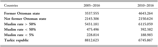 An empirical analysis focusing on the impact of religion was also conducted. In this setup, the Muslim rate variable was multiplied by other explanatory variables in order to test whether Islam has an impact on them. The relevant estimation results are presented in Table 4 as Model 7. This model suggests that Islam has some impact on the Turkic and Ottoman dummy variables. A former Ottoman recipient with no Muslim population receives 363.66 percentFootnote 57 more Turkish aid, but a one-point increase in the Muslim population in this recipient decreases this ratio to 361.76 percent.Footnote 58 This is consistent with the previous model, which implies that Ottomanism and Islamism are mutually exclusive. Similarly, a one-point increase in the Muslim population decreases the amount of aid given to Turkic republics by 3.33 percent.Footnote 59