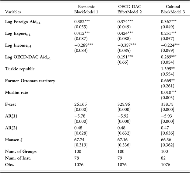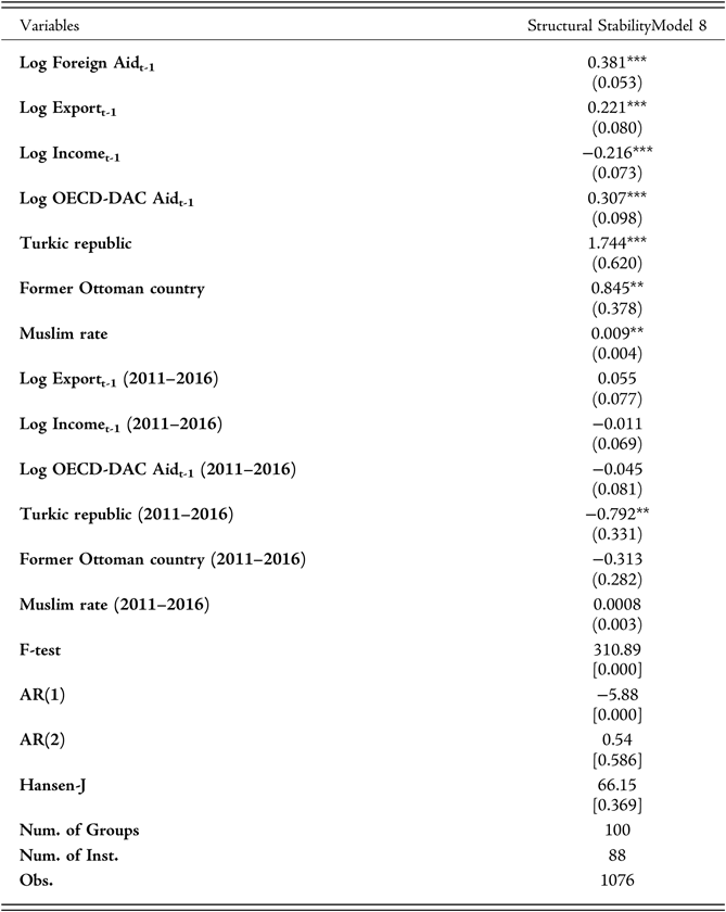 The estimated coefficients related to the lagged values of the Turkish foreign aid variable meet the aforementioned stability condition, implying that the models are stable and that Turkey is a persistent donor.Footnote 49 The estimation results pass diagnostic checks. The models are estimated to be statistically significant; there is no autocorrelation of the second order, and the instruments are valid according to the F-test, Arellano-Bond test, and Hansen-J test, respectively.