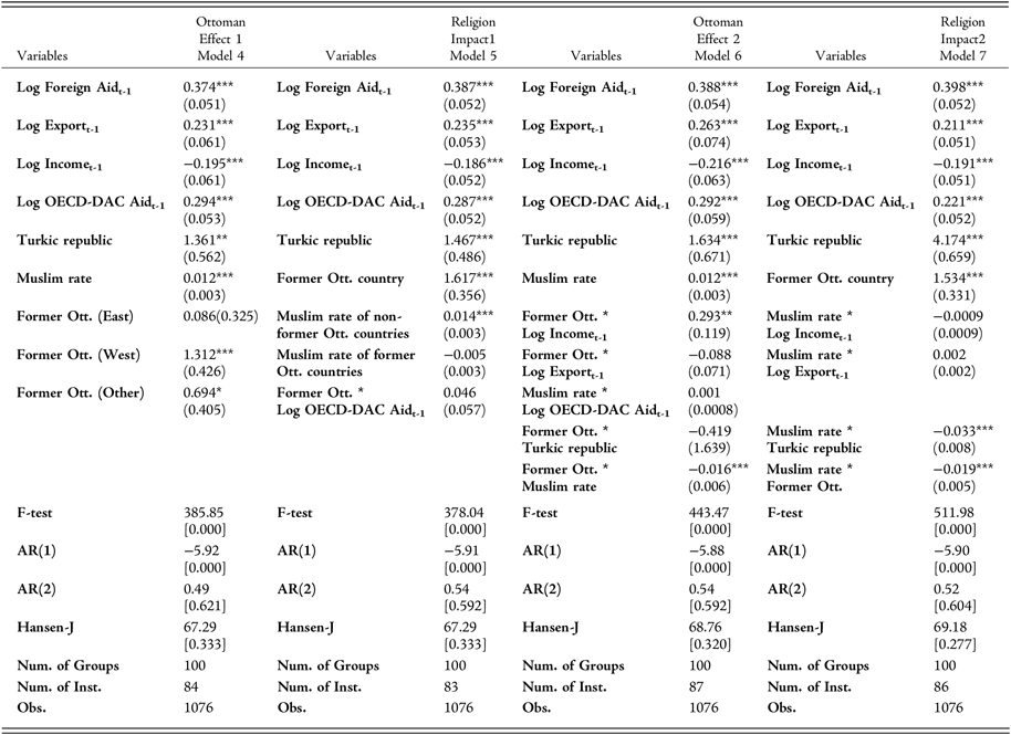 In addition, to elaborate on this discussion, we have split former Ottoman lands into three sub-categories: the first includes former Ottoman territory in the east (in the Middle East and North Africa), the second former Ottoman territory in the west (in the Balkans and Eastern Europe), and the third former Ottoman territory located in other parts of the world.Footnote 40 In doing this, we are able to evaluate whether there is any regional pattern to the Ottomanist tendency in Turkish foreign aid policy. Subsequently, we specify another modified model so as to test whether the influences of Islamism on the amount of Turkish aid develops a different aspect in former Ottoman lands. Finally, we interact both the Ottoman dummy and the Muslim population’s rate variables with other explanatory variables in order to see whether these two variables have a meaningful effect on the interacted variables.Footnote 41