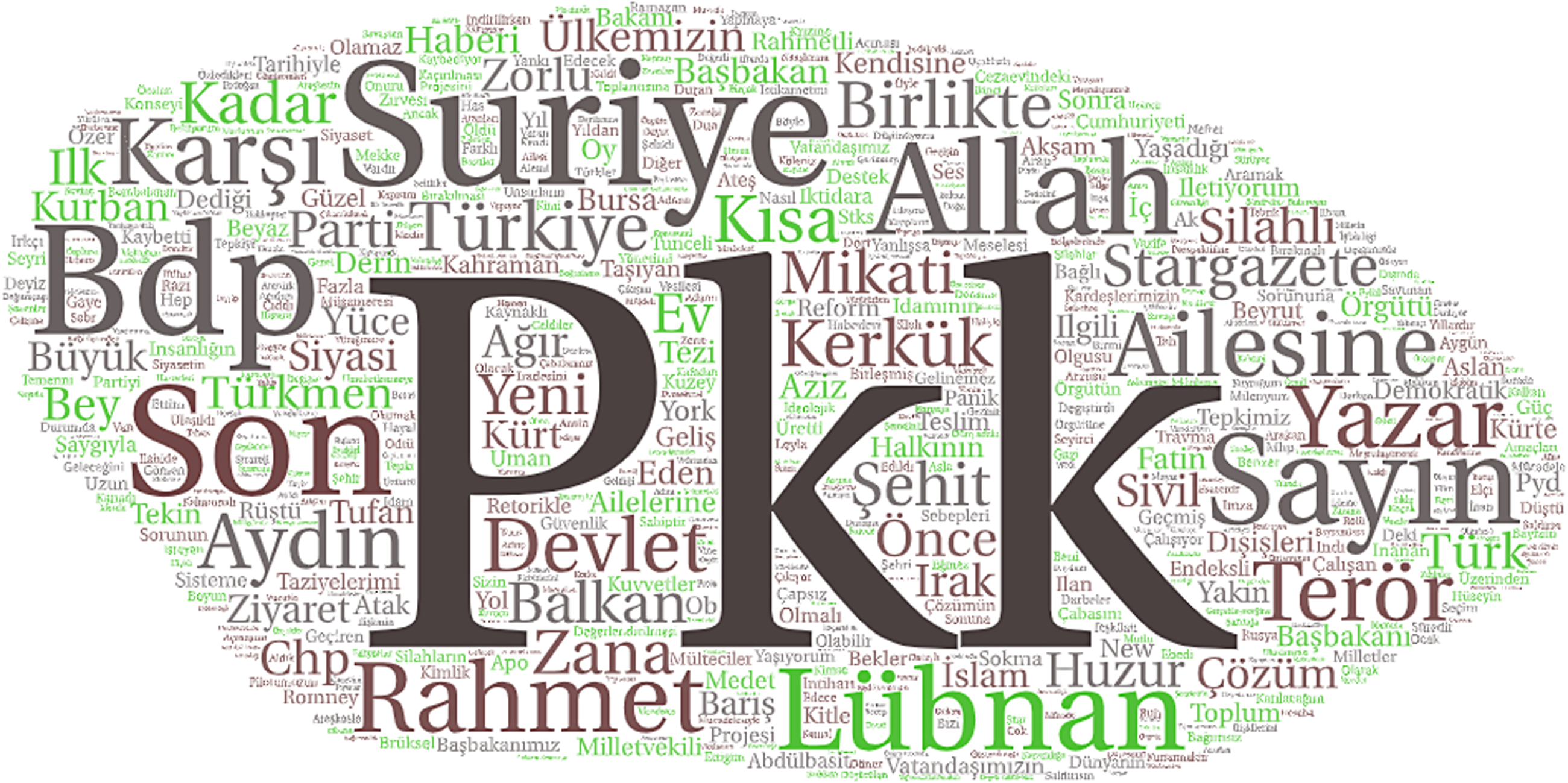 We find that terror is the most frequently used keyword among all tweets. This keyword was sometimes used for terror in Turkey and sometimes for terror in other countries. For the purposes of this article, we focused on the use of the term terror addressing the PKK and the Kurdish movement in Turkey and in Syria. The use of terror in Erdoğan’s tweets shows how he linked the PKK with the BDP. In September 2012, Erdoğan shared a series of tweets that read: